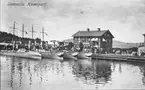 Tryckt text på kortet: "Uddevalla. Vy öfver hamnen där det är lif och rörelse." "Reproduktion av foto tillhörande Uddevalla Museum. 23." "Carla-Förlaget, Lysekil."