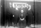 Härlunda socken. Milsmaden. På stubben: Carl Magnus Andersson. Ellen Andersson, Gunnar Andersson, Eric Brodén, Skara, Eva Vilhelmina Andersson (maka till Carl Magnus A.) och Constance Brodén, Skara. C:a 1925.