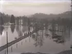 Foto norrifrån på översvämning vid Göteborgsvägen, strax norr om Mölndalsbro, okänt årtal. En manlig cyklist kämpar i vattnet.