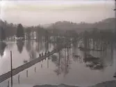 "Öfversvämning av lilla Järnvägen vid Bajan Munkedal." "Banchef Svensson- Svensson J:r- okänd- okänd. I bakgrunden Nils Anderssons hus (fotografen har stått på Hede mark)."