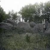 Birgitta Marnung vid gånggriften i Gillhög. Gånggriften är en megalitgrav. Megalitgravar (av grekiska mega, stor, och lithos, sten) eller storstensgravar är en serie typer som i Sverige endast anläggs under stenåldern, från c:a 3600-2900 f.Kr. Gånggriften består av stora stenblock, vilka är ställda så att de bildar en gravkammare och en tvärställd gång som leder in till kammaren. Sett uppifrån bildar kammare och gång ett "T". Gravkammaren omges ofta av en hög, som dock relativt ofta är låg och bara runt 1/3 av kammarens höjd som invändigt ofta är närmare 2 meter eller mer. Gånggrifterna ersatte dösarna och byggdes runt 3350-3200 f.Kr. varefter de användes under några sekler, men fynd har visat att man spontant eller periodvis ofta har använt gravkamrarna under senneolitikum och stenålderns slut vilket är detsamma som hällkistornas tid. Därtill har man sporadiskt gjort begravningar i högen eller i kammaren samt dess gång ända fram till järnåldern. I främst kammaren har man hittat obrända skelettdelar och en del enklare föremål från den primära perioden som sträcker sig till c:a 2900 f.Kr. samt spridda fynd från efterföljande perioder. Källa Wikipedia.