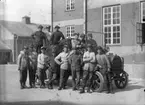 Linus, Maria och Viktor Karlsson framför huset i Karlstorp, 1930-tal