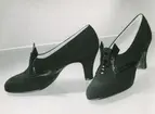 "Mellanskor". Svart skinnsko med hög klack och dekorativ plös.