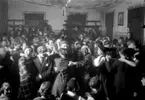 Luciafirandet 13 december 1966 Sex unga män är utklädda i komiska maskeradkläder. En av dem bär en Luciakrona med ljus i på huvudet. Han står med ryggen mot kameran och har en uppslitsad del av skjortan upptill där ett par målade ögon skymtar fram på hans bara rygg. En annan bär överdimensinerade glasögon. Alla är målade i sina ansikten.
