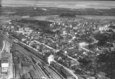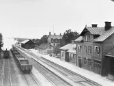 Foto tagit över bangård och lokstall, personvagn TGOJ 3 klass. Stationen öppnad 1877 01 01.
