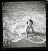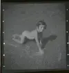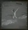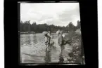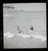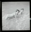 Badande pojkar i en sjövik, där en av dem har en simdyna runt magen.