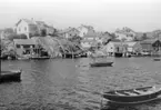 Tryckt text på kortet: "GRAVARNE. Sjöbodar". Notering på kortet: "Sjöbodar innanför Fiskekär ca 1930".