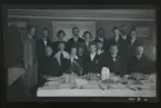 Bröllopsseder, möhippa. Arrangörerna till den troligen första "mösexan" i Sala. Fyra unga kvinnor utklädda i herrkostymer, studentmössor och lösmustacher.