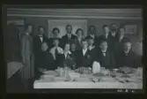 Grupporträtt av ett bröllopssällkap, fotograferade utanför ett hus vintertid. "Solhem Äsköping, Matilda och Ernfrid Karlssons dotter Ruth (brud)."