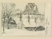 "På Hvita Bergen 1924", Stockholm, Södermalm, Vita bergen, bebyggelse och Sofia kyrka i Bakgrunden. Teckning av Ferdinand Boberg.