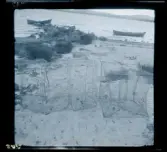 2791 Tunisien Kartago. Ett nät och båtar på strand.