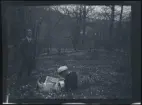 En av döttrarna leker med en hundbland vitsippor på tomten till familjen Morthensens villa Solveden, Djursholm.