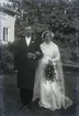 Bröllopsfoto taget i ateljé. Brudparet, bestående av en kvinna och en man, sitter svagt lutande mot varandra, mellan sig har de en bukett. Bakom brudparet står ytterligare två personer, en man och en kvinna, som enligt uppgift var brudparets vittnen. Mannen håller sin arm om kvinnan och hans hand ligger på kvinnans höft.