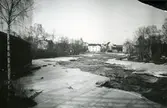 Gruslastat tåg som spårat ur på väg till Edsbyn. Järnvägen var 1900 nybyggd. Vid olyckan fick en man sin ena arm avsliten. I bakgrunden ses "Engmans" som idag ersatts med ålderdomshemmet Sunnangården.