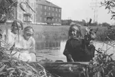 "En färd på Mölndalsån". Systrarna Elin och Gertrud Andersson med syskonbarnen Sonja och Aina Rundberg. De sitter i en båt vid Mölndalsåns strand 1927. I bakgrunden ses Svalöfsbolaget.