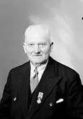 EN MAN MED MEDALJER PÅ ROCKSLAGET STÅENDE BLAND BLOMMOR PÅ SIN HÖGTIDSDAG.