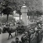 Ur byggmästare Johannes Nilssons fotoalbum från 1914. Kraftstationen som låg på Norrdal i kv Älgen. Gavlarna uppvisar jugendestetik i form och dekor. På gavelfältet i bild angavs vilka ägarna var, Yngeredsfors Kraft AB, och på motsatt sida fanns ett stort dekorativt fönsterparti. I bakgrunden syns Varbergs vattentorn som stod klart 1899. Transformatorn blev så småningom överflödig och stod länge oanvänd innan den revs.