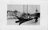 Lastångfartyget ALDEBARAN av Gävle liggande i Åhus hamn omkr. 1920. Fartyget var ett typiskt Fredriksstadsbygge med förliga masten placerad på backen och aktre pålmasterna på poopen.