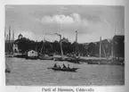 Tryckt text på kortet: "Uddevalla. Den lifliga sjöfarten sätter sin prägel på staden." "Reproduktion av foto tillhörande Uddevalla Museum." "Carla-Förlaget, Lysekil."
