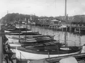 Text på kortet: "Sanne-båtar i Uddevalla hamn. T.v. Odensvold, t.h. trålare och Jane, samtliga s/s. År 1908. Foto Thore Nihlén".