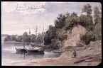 "Segelbåtar på vattnet." Leksand 28 juli 1885. Akvarell av Fritz von Dardel. I bakgrunden skymtar Leksands kyrka.