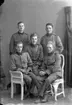 Enligt medföljande text: "Utanför stora salongen på Backamo. Frv bla: Disp Carlander Munkedalsbruk, Major Zetterberg, Moster Anna Wallgren, Kapten NattoDag, fru Carlander, Pastor Flodin, häradshövding Ursel (kusin till morfar)".