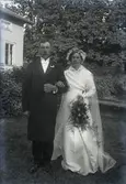 Ateljébild på ett brudpar. Kvinnan har brudklänning och slöja samt blombukett. Enligt Walter Olsons journal är bilden beställd av Enoc Abrahamsson.