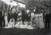 Bröllop. Brudpar och bröllopsgäster fotograferade utanför ett tegelhus. (8 bilder). Osäkra uppgifter om brudparet. Bruden kan vara Johanna Lovisa Carlsson, Fastarp 2, född på Speletorpet, torp under Fagared: Brudgummen Johan Victor Ljungdahl, född på Kärret i Ljungby. Bodde vid denna tid på Halvbondagärde. F d korpral vid Skånska Dragonregementet. När paret utflyttade till Kungsbacka 1908, hade han titeln poliskonstapel. Huset bakom troligen byggmästare Wallenius fastighet (Första tegelhuset i Tvååker) vid gamla mejeriet i Tvååker. Paret längst till höger är Johan Carlsson och hans fru Hulda Carlsson.