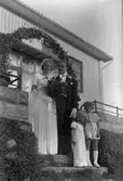 Margareta Einarsson och Rune Ström har gift sig i Heliga Trefaldighetskyrkan. Här ses brudparet vid den lövade kyrkporten. Bruden bär slöja, krona och handskar. Brudbuketten består av liljekonvaljer. Brudgummen har en nejlika på frackslaget. Porträtt.
