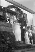 Systrarna Einarsson; Margareta och Birgitta, kramas utanför kyrkporten. Margareta har just gift sig med Rune Ström (mannen i frack, med ryggen mot fotografen). Rune får en kram av svärmor; Ingrid Pettersson. Genom kyrkporten kommer Harriet Malmberg Svanberg. (Birgitta Einarsson gifte sig senare och fick namnet Sparv)
