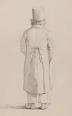 "Bonde från Torlösa" Man i dräkt med hatt och käpp, stående i helfigur, bakifrån. Blyertsteckning i storformat av Otto Wallgren.
