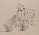 "Bonde från Bosarp" Man i helfigur i dräkt sittande sovandes mot en vägg. Blyertsteckning i storformat av Otto Wallgren.
