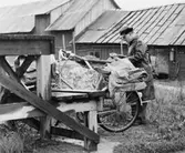 Lantbrevbärare, postiljon Erik Bergman (cykelåkande) i Delsbo. April 1956. Brevbäringsturen är 2 ½ mil lång och omfattar nästan 300 hushåll. Postväskan väger ofta 30-40 kg.