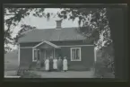 "Sofielund, Sofia f. 1869, Alfred Eklund, Elsa, Linda, Svea f. 96, 98, 1902." En familj framför sitt hus.