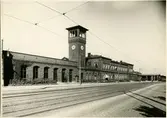 Uppsala centralstation och spårvagnsspår sedd från gatusidan.