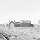 Stationsområde och bangård med bostadhus i bakgrunden.