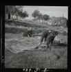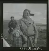 En kvinna och en flicka står intill en torkställning där det hänger flätor av gräs/ hö.