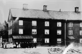 "Böggninga", gamla fabrikens arbetarbostäder, och en grupp boende som står uppställda framför.