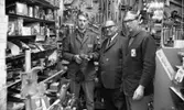 Rönneshytta Handel 4 september 1967 En man i grå kostym, vit skjorta, svart slips och grå skor står i Rönneshyttan vid en varuautomat. På automaten står: "Service Natt och Dag."
