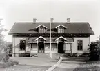 skola, elevbostad, stupränna, bänk, träd, cykel, soptunna