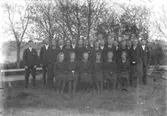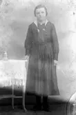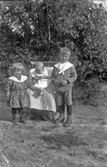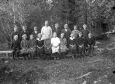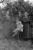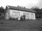 Famlij framför enkelhus i Hede med husdjur och trattgrammofon