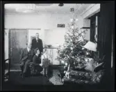 Jul på Prytzgatan 38 i Broslätt, Mölndal, cirka 1957. Porträtt av pojken Lennart Berndtsson och hans föräldrar Leif och Inga Maj Berndtsson. De sitter i en fåtölj i vardagsrummet.