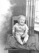 Ett barn sitter på en kudde med en broderad bonad bakom sig, Östhammar, Uppland