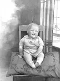 Foto av baby som ligger på mage med kudde under sig. Text baksida kort: "Heja grabbar här kommer Per Olof Skärgård".