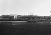 Mjölby station med rosplantering. D-lok med personvagnar på stationen. Resgodsvagn SJ F04.
