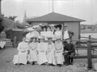 Enligt fotografens noteringar: "Brudpar Nyblom med bröllopsgäster på Saltkällan någon gång omkring 1920-33."