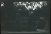 Tre ungdomar poserar sittandes på en gärdesgård, Backen eller Högen okänt årtal. I bakgrunden ses åkrar. 1. Okänd kvinna. 2. Lennart Pettersson. 3. Okänd kvinna.