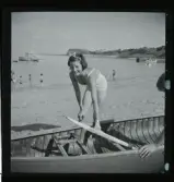 Två unga män poserar vid livboj ombord på M/S Vikingland. Fartyget ligger i Grekisk hamn.