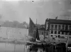 Vykort över hamnen i Sundsvall. Båtar i förgrunden och magasinen i bakgrunden.