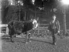 Enligt senare noteringar: "Hjalmar Olofsson eller Hjalmar i Hagen, var svåger till Oscar Färdig. Hjalmar är mannen med hatten. se även 30184." (BJ) Text på asken: "Hjalmar med kor."
